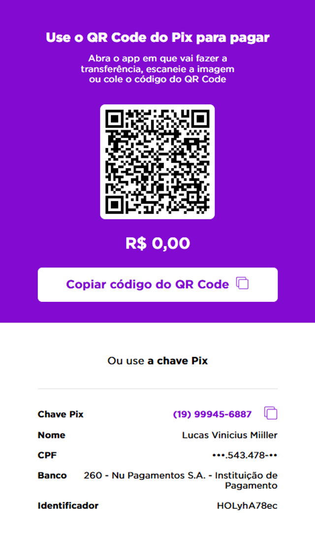 Olá, queridos convidados! Quem quiser presentear via PIX, basta escanear o QR Code da imagem ou então utilizar a chave PIX 1999945-6887...