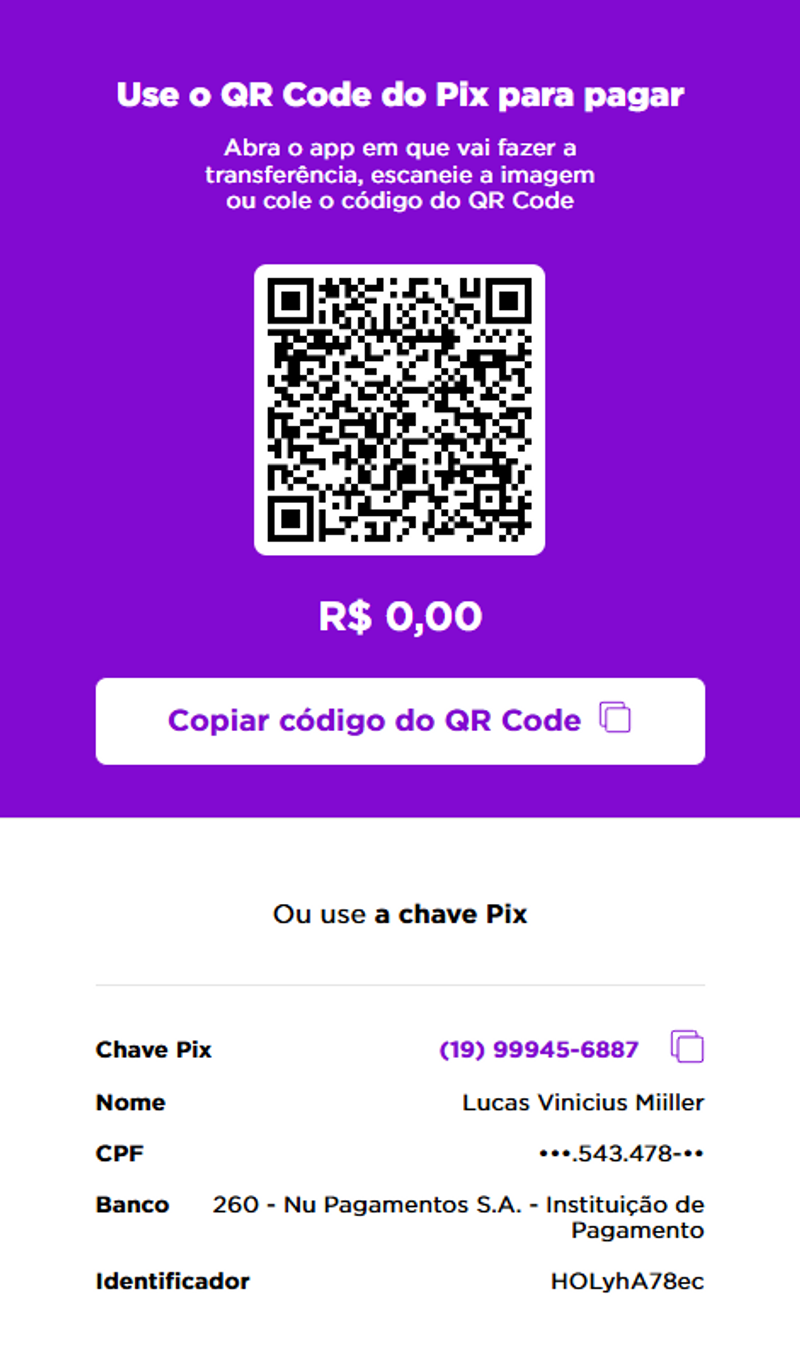 Quem quiser presentear via PIX, basta escanear o QR Code da imagem ou então utilizar a chave PIX 1999945-6887 (celular do noivo).
